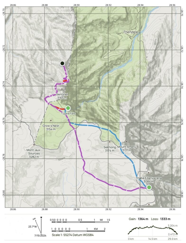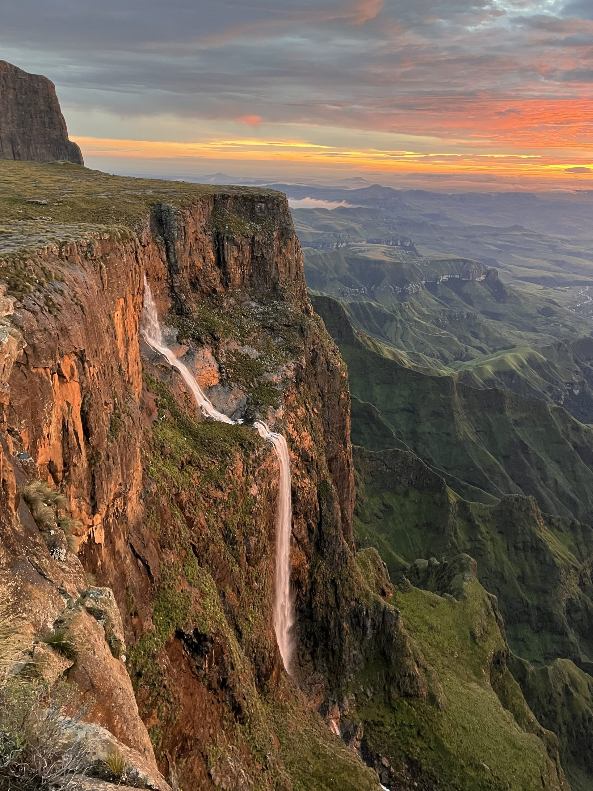 On day 1 we shuttle to the Sentinel car park and ascend gradually for a few kilometers to the renowned chain ladders. After climbing the chain ladders and reaching the summit we have lunch at the highest falls in the world, Tugela falls, before heading along the amphitheatre to find a quiet camping spot. The sunset and sunrise views are a highlight, standing above the vast basalt cliffs with views across to the Sentinel and the Tugela falls to the north, and the eastern buttress to the south.